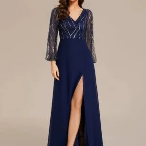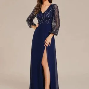 Elegant Evening Dress Maxi Long Sequin High fork with Long Sleeves 2024 Ever pretty of A-Line Navy Blue Bridesmaid Dress
