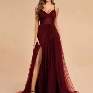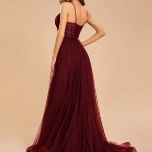 Sexy Evening Dress Deep V-neck See Through Spaghetti Strap High Split Tulle 2024 Ever Pretty of Burgundy Sheer Bridesmaid Dress