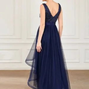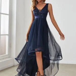 Elegant Evening Dresses Sleeveless High-Low V Neck Tulle 2024 Ever pretty of Prom Dresses with Navy Blue Sequin Appliques Gown