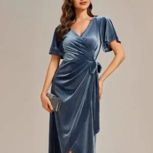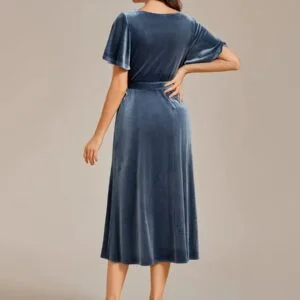 Elegant Evening Dresses Short Sleeves V-Neck Tea Length With Short Sleeves 2024 Ever Pretty of Dusty Navy Wedding Guest Dress